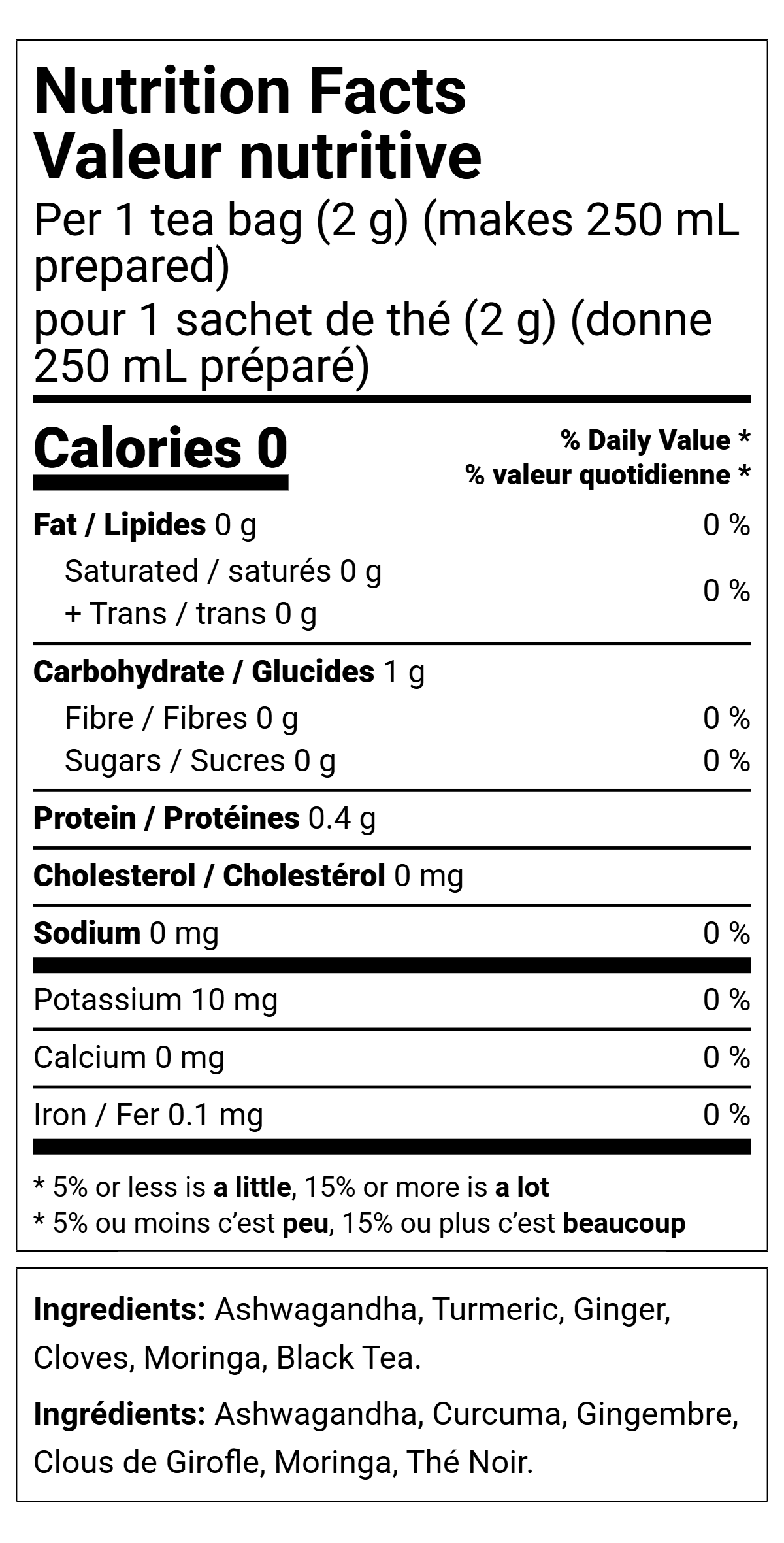 Black Tea, Cloves, Ashwagandha, Turmeric, Ginger, Moringa